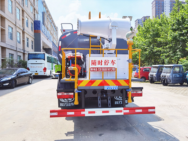 上裝配置:罐體采用國標Q235碳鋼板制作,可選用30米、40米中型霧炮,罐體采用機器壓板一次性成型技術,采用先進旋邊機,罐體包罐機工藝保證了罐體制作的精度和美觀。罐體厚度4mm,前后封頭5MM加厚型,罐體實際容積12立方(12噸),程力獨有烤漆工藝,多層底漆、防腐除銹,面漆噴涂。 功能齊全,配備前沖、后灑、側噴、綠化灑水炮,采用優質水泵,合理設計水路管道,氣控取力器,作業能力強;采用柴油發電機大功率霧炮機,噴灑距離選裝30-40米射程,運用范圍廣泛。
